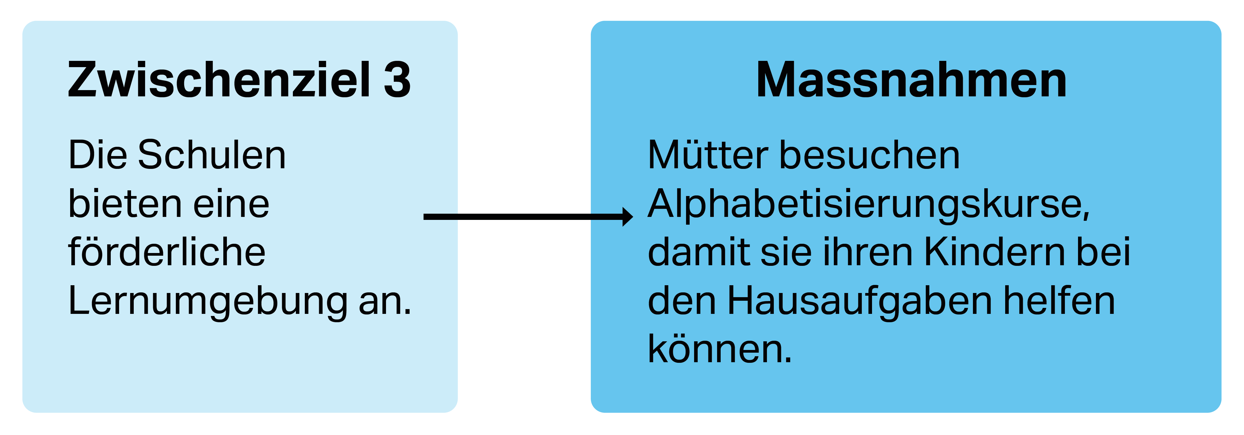 Zuerst erhebt unser Team die Situation der einzelnen Familienmitglieder: Entwickeln sich die Kinder ihrem Alter entsprechend? Gehen sie zur Schule und haben sie genügend Zeit zum Spielen? Gehen die Eltern wertschätzend miteinander und mit den Kindern um? Dann wird festgehalten, welche Ziele die einzelnen Familienmitglieder erreichen möchten und welche Ressourcen sie mitbringen, wie zum Beispiel handwerkliches Geschick oder ein Stück Land. Wir halten auch fest, welche Eigenleistungen wir von den Müttern und Vätern erwarten, wie etwa den Besuch von Elternworkshops. In Gesprächen mit den lokalen Partnern wird ebenfalls erhoben, welche Ressourcen diese mitbringen und wo noch Hilfe nötig ist: Wie gut ist der bauliche Zustand der Schulräume, und wie sind diese eingerichtet? Wie gut sind Lehrkräfte oder Mitarbeitende von Behörden ausgebildet? Haben die Spar- und Leihgruppen gut ausgestattete Büros und ausreichende Kenntnisse in Betriebs-wirtschaft? Danach werden Ziele, Meilensteine auf dem Weg dorthin und gegenseitige Erwartungen festgehalten.